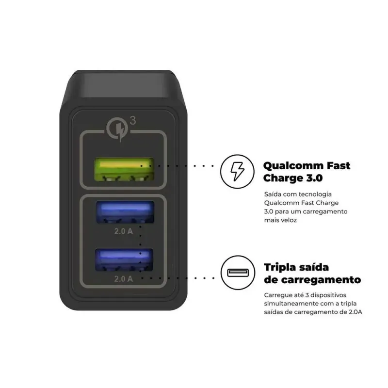 SmartphonesAcessórios para SmartphonesCarregadoresREEMBALADO - Carregador Turbo Triplo até 18W - Preto - Gshield